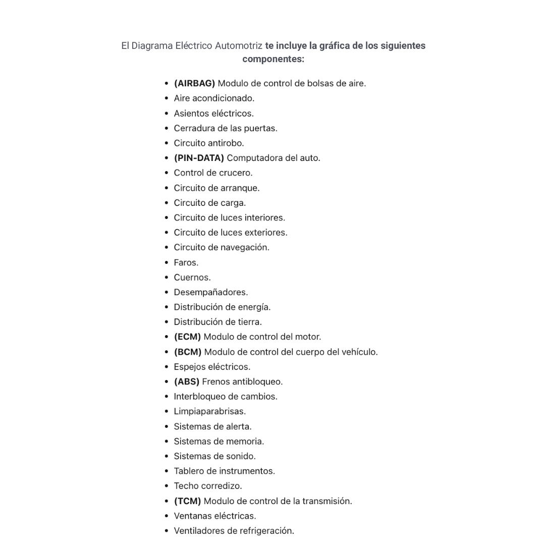 El Diagrama Eléctrico Automotriz te incluye la gráfica de los siguientes componentes: