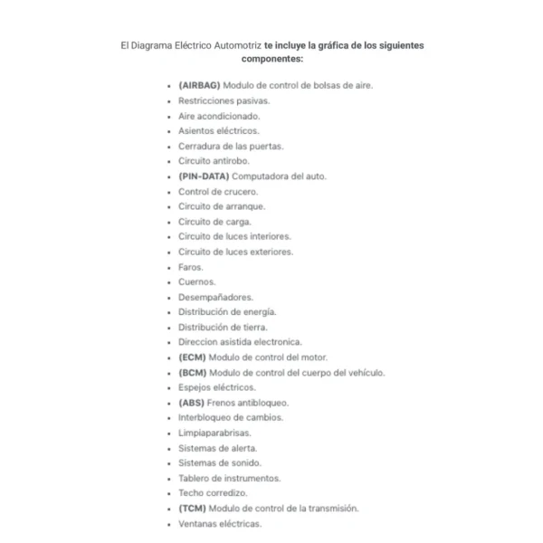 El Diagrama Eléctrico Automotriz te incluye la gráfica de los siguientes componentes: