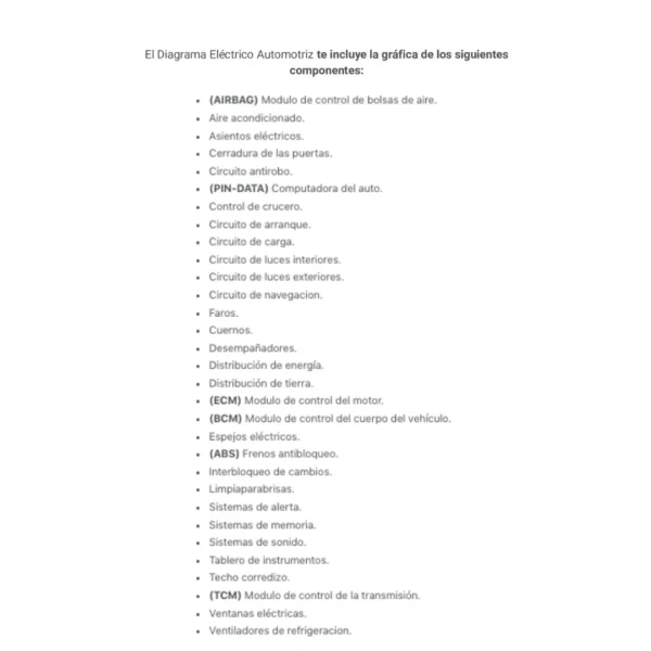 El Diagrama Eléctrico Automotriz te incluye la gráfica de los siguientes componentes: