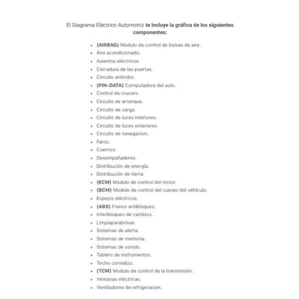 El Diagrama Eléctrico Automotriz te incluye la gráfica de los siguientes componentes: