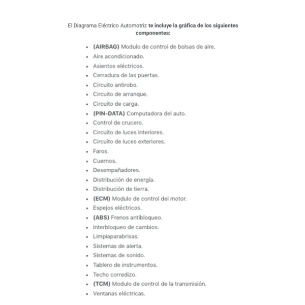 El Diagrama Eléctrico Automotriz te incluye la gráfica de los siguientes componentes: