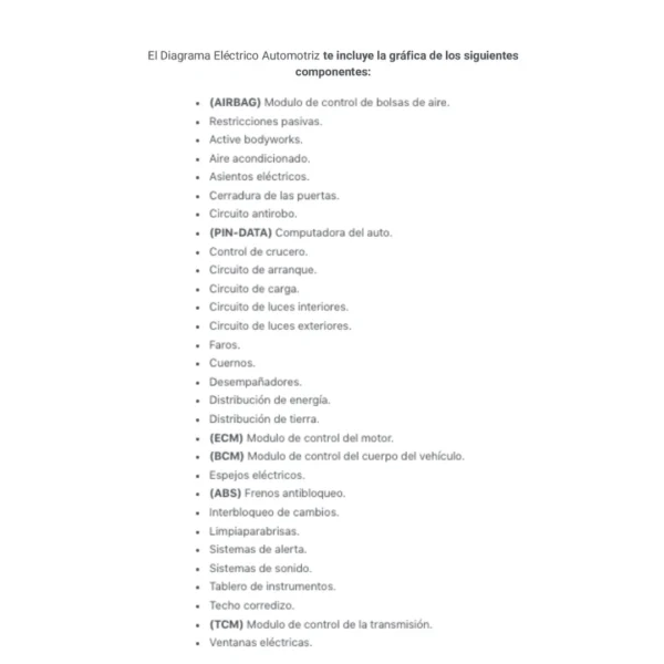 El Diagrama Eléctrico Automotriz te incluye la gráfica de los siguientes componentes: