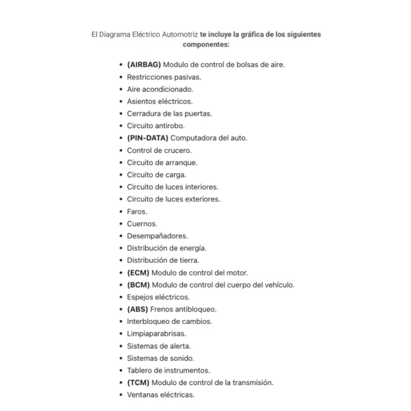 El Diagrama Eléctrico Automotriz te incluye la gráfica de los siguientes componentes: