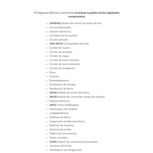 El Diagrama Eléctrico Automotriz te incluye la gráfica de los siguientes componentes: