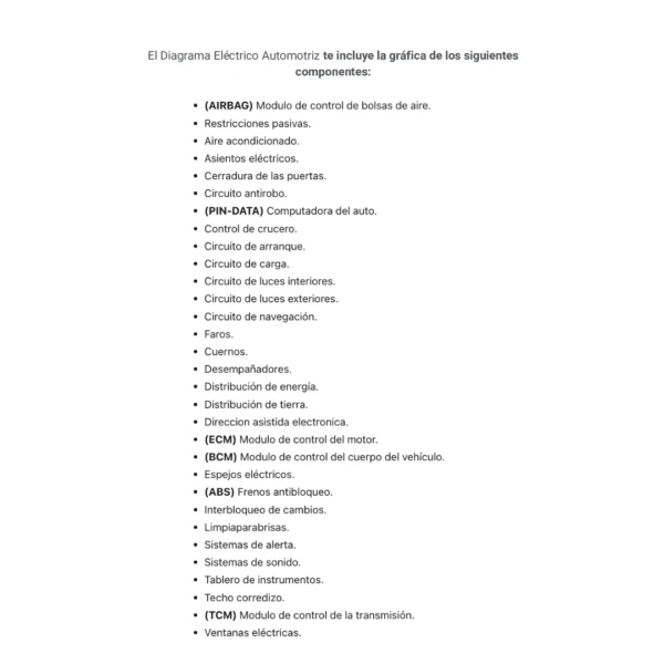 El Diagrama Eléctrico Automotriz te incluye la gráfica de los siguientes componentes: