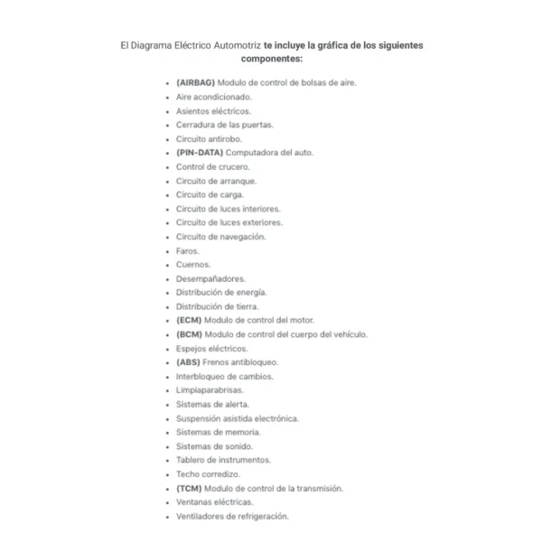El Diagrama Eléctrico Automotriz te incluye la gráfica de los siguientes componentes:
