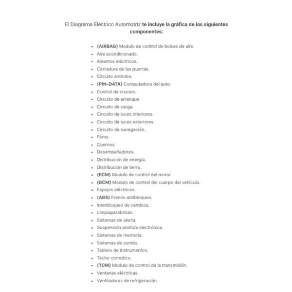 El Diagrama Eléctrico Automotriz te incluye la gráfica de los siguientes componentes: