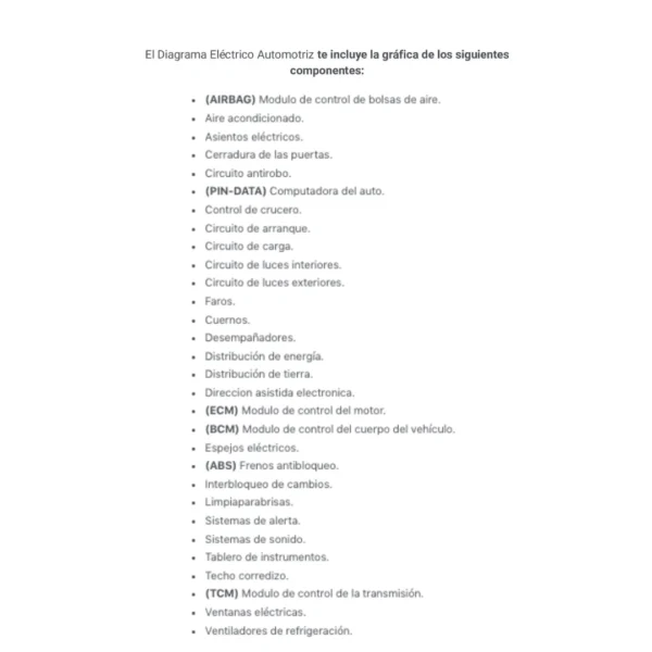 El Diagrama Eléctrico Automotriz te incluye la gráfica de los siguientes componentes: