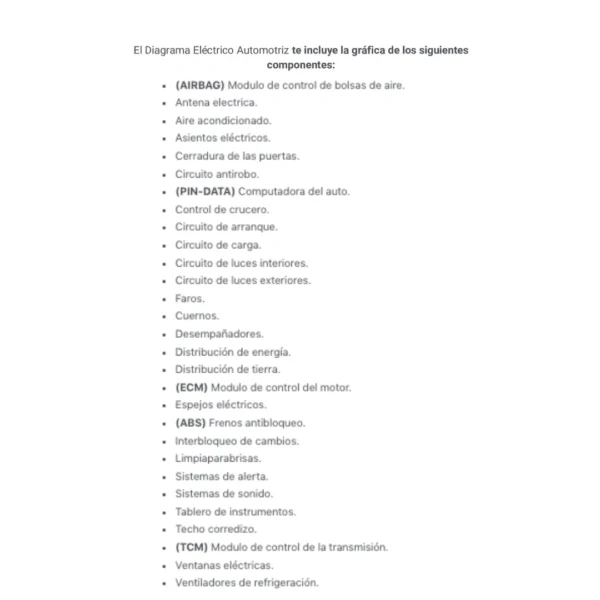 El Diagrama Eléctrico Automotriz te incluye la gráfica de los siguientes componentes: