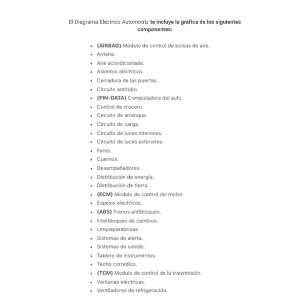 El Diagrama Eléctrico Automotriz te incluye la gráfica de los siguientes componentes: