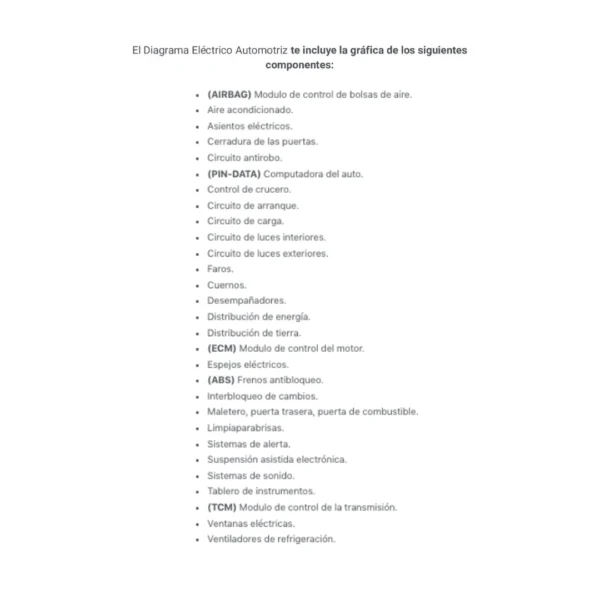 El Diagrama Eléctrico Automotriz te incluye la gráfica de los siguientes componentes: