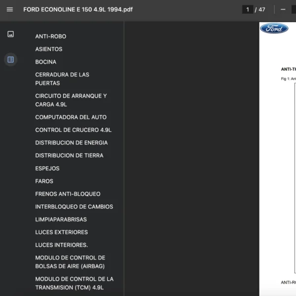 Conexiones. Sensores. Y otros componentes que intervienen en el funcionamiento correcto de los circuitos electrónicos (también llamados en inglés “wiring diagram”). Si estas buscando un manual eléctrico de la marca Ford modelo ECONOLINE E 150 de 4.9L año 1994 , este es el diagrama automotriz que necesitas.