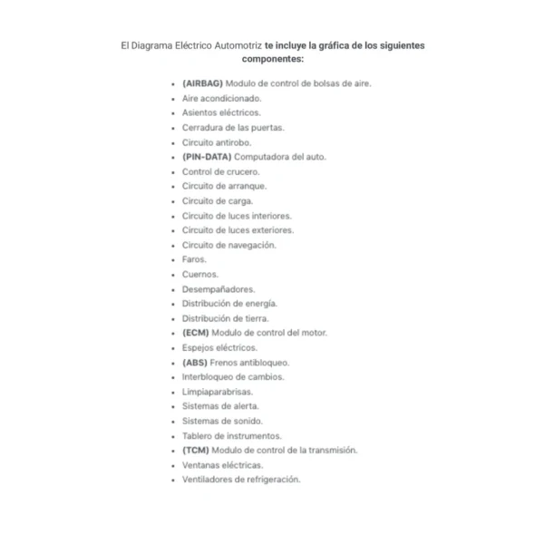 El Diagrama Eléctrico Automotriz te incluye la gráfica de los siguientes componentes: