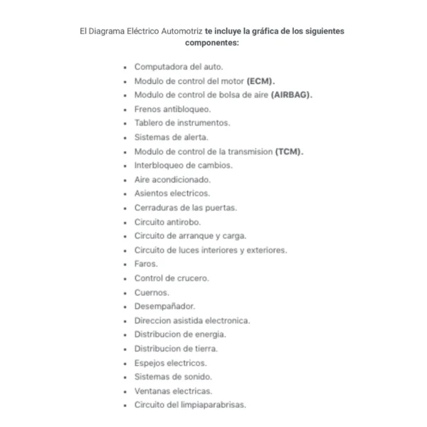 El Diagrama Eléctrico Automotriz te incluye la gráfica de los siguientes componentes: