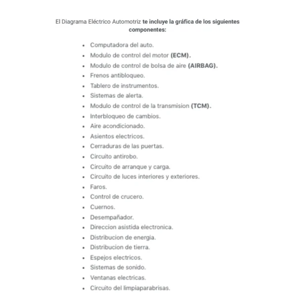 El Diagrama Eléctrico Automotriz te incluye la gráfica de los siguientes componentes: