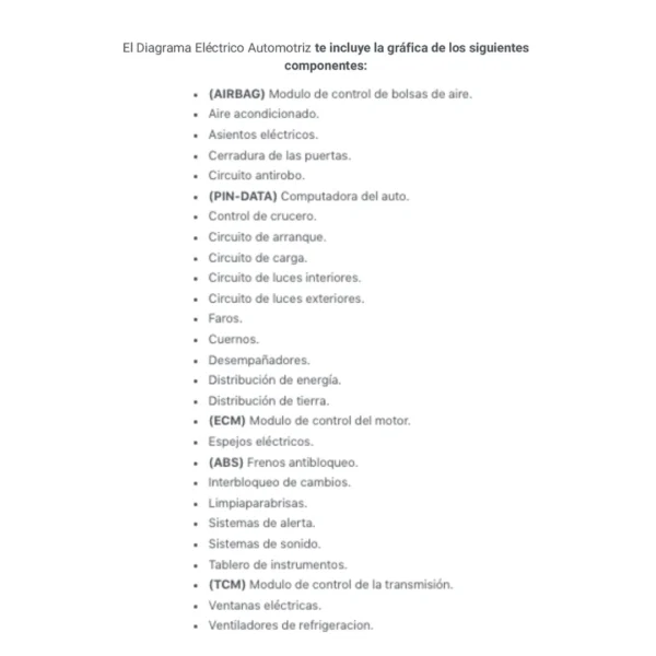 El Diagrama Eléctrico Automotriz te incluye la gráfica de los siguientes componentes: