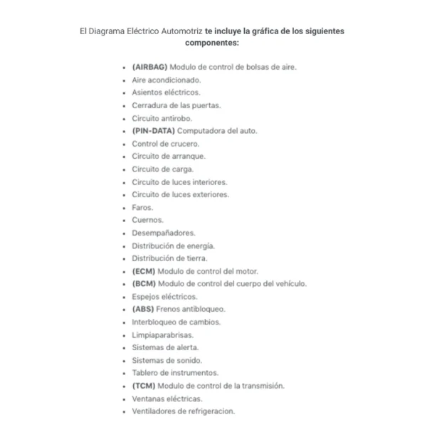 El Diagrama Eléctrico Automotriz te incluye la gráfica de los siguientes componentes: