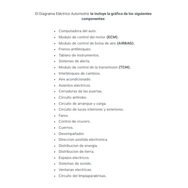 El Diagrama Eléctrico Automotriz te incluye la gráfica de los siguientes componentes: