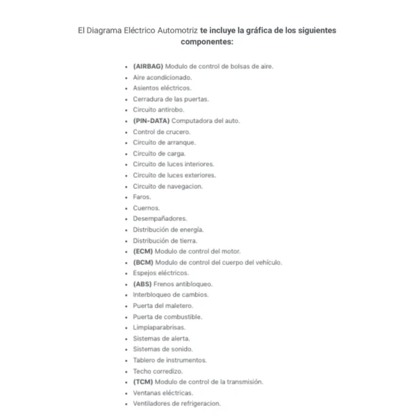 El Diagrama Eléctrico Automotriz te incluye la gráfica de los siguientes componentes: