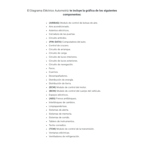 El Diagrama Eléctrico Automotriz te incluye la gráfica de los siguientes componentes: