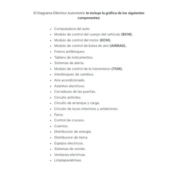 El Diagrama Eléctrico Automotriz te incluye la gráfica de los siguientes componentes: