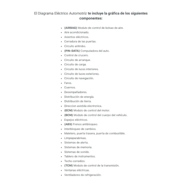 El Diagrama Eléctrico Automotriz te incluye la gráfica de los siguientes componentes:
