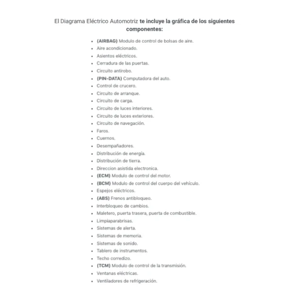 El Diagrama Eléctrico Automotriz te incluye la gráfica de los siguientes componentes: