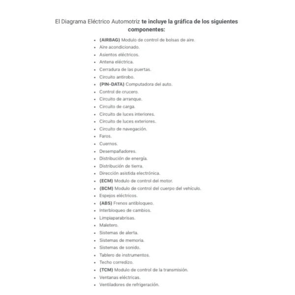 El Diagrama Eléctrico Automotriz te incluye la gráfica de los siguientes componentes: