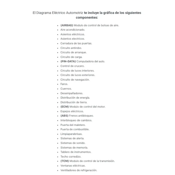 El Diagrama Eléctrico Automotriz te incluye la gráfica de los siguientes componentes: