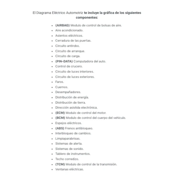 El Diagrama Eléctrico Automotriz te incluye la gráfica de los siguientes componentes: