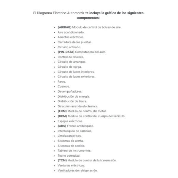 El Diagrama Eléctrico Automotriz te incluye la gráfica de los siguientes componentes: