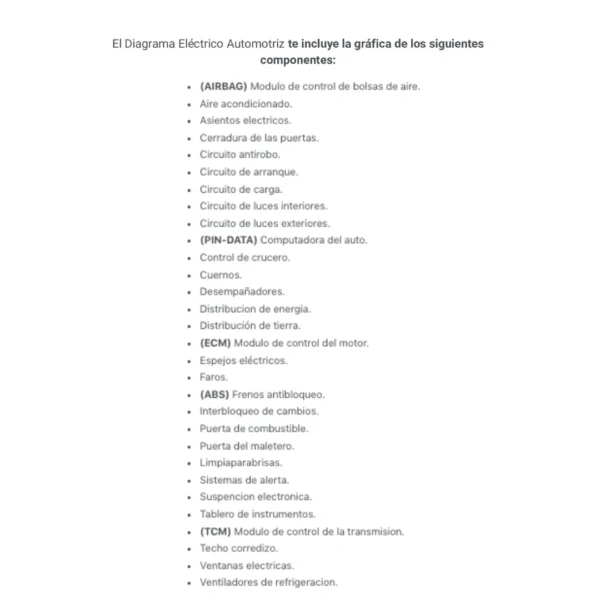 El Diagrama Eléctrico Automotriz te incluye la gráfica de los siguientes componentes: