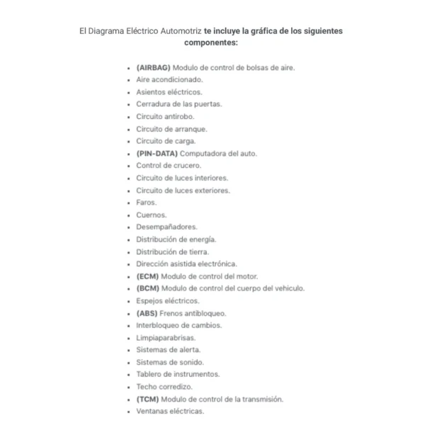 El Diagrama Eléctrico Automotriz te incluye la gráfica de los siguientes componentes: