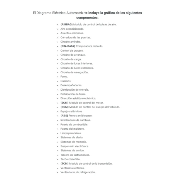 El Diagrama Eléctrico Automotriz te incluye la gráfica de los siguientes componentes:
