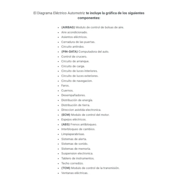 El Diagrama Eléctrico Automotriz te incluye la gráfica de los siguientes componentes: