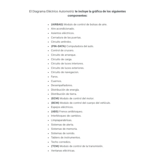 El Diagrama Eléctrico Automotriz te incluye la gráfica de los siguientes componentes:
