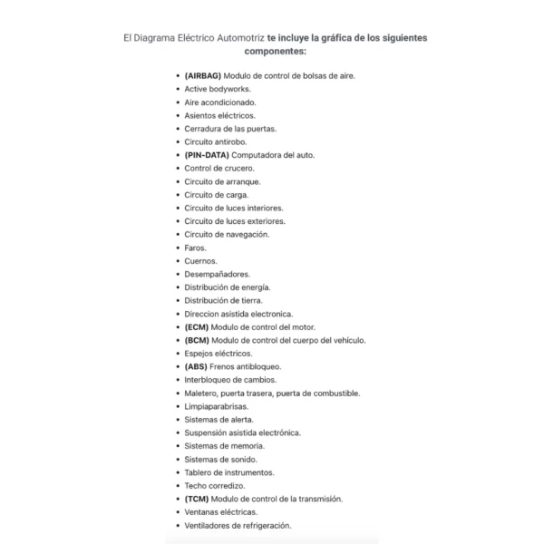 El Diagrama Eléctrico Automotriz te incluye la gráfica de los siguientes componentes:
