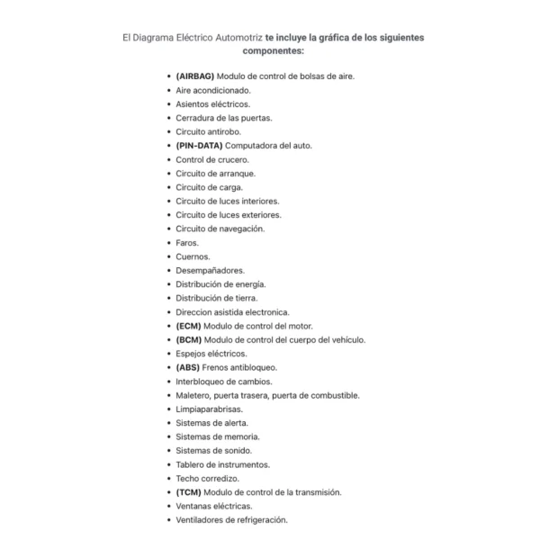 El Diagrama Eléctrico Automotriz te incluye la gráfica de los siguientes componentes: