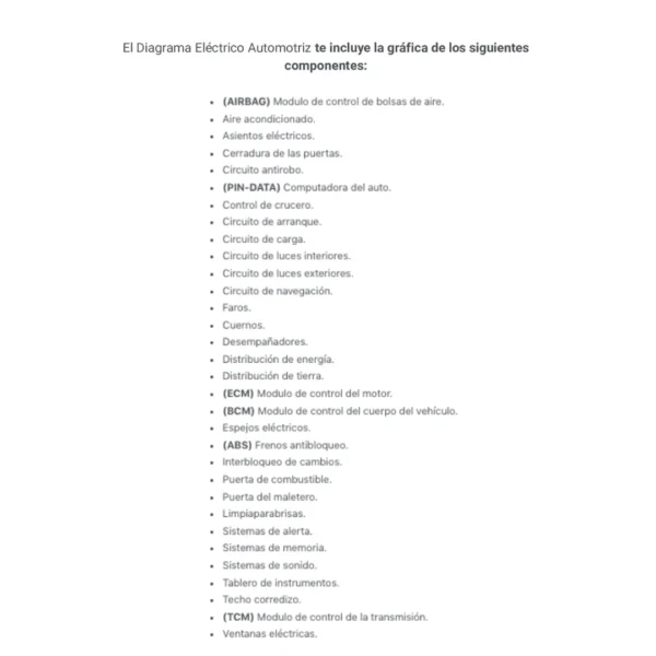 El Diagrama Eléctrico Automotriz te incluye la gráfica de los siguientes componentes: