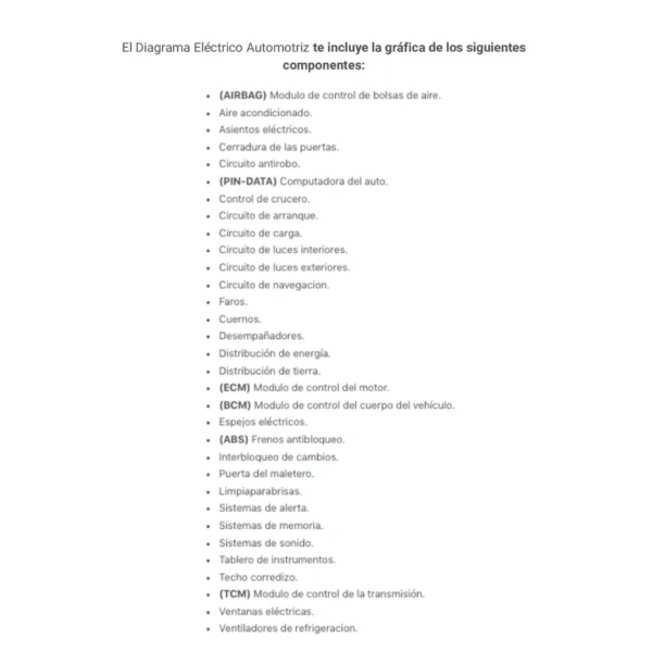 El Diagrama Eléctrico Automotriz te incluye la gráfica de los siguientes componentes: