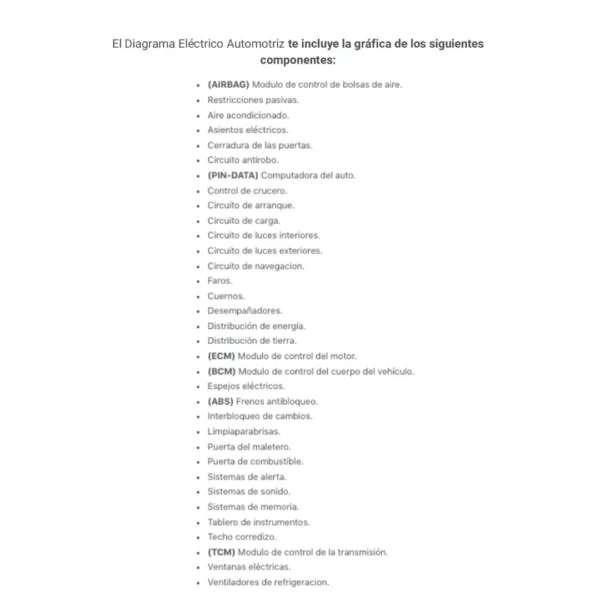 El Diagrama Eléctrico Automotriz te incluye la gráfica de los siguientes componentes: