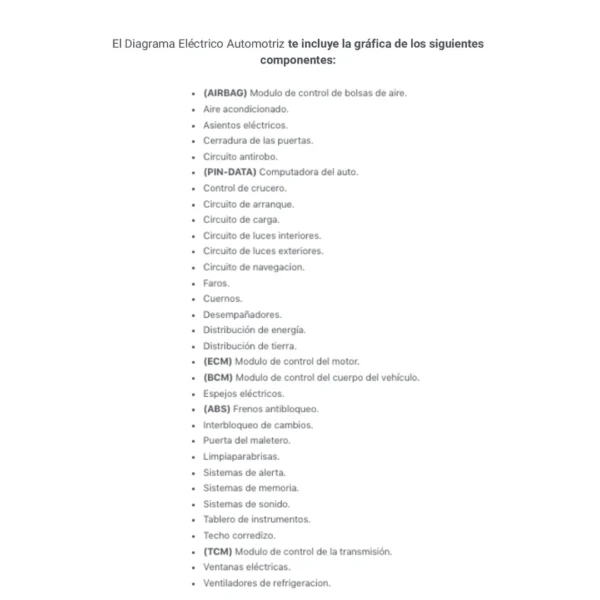 El Diagrama Eléctrico Automotriz te incluye la gráfica de los siguientes componentes: