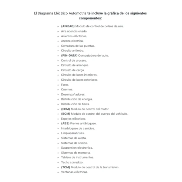 El Diagrama Eléctrico Automotriz te incluye la gráfica de los siguientes componentes: