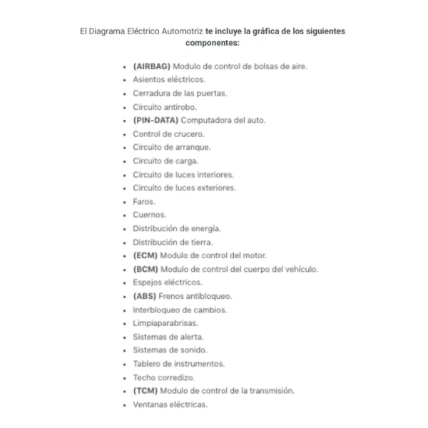 El Diagrama Eléctrico Automotriz te incluye la gráfica de los siguientes componentes: