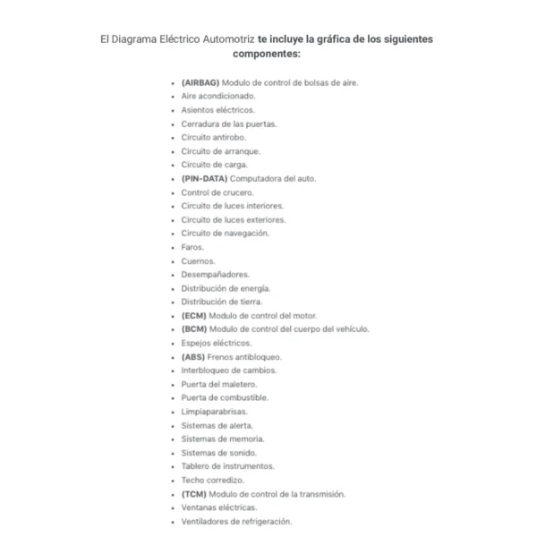 El Diagrama Eléctrico Automotriz te incluye la gráfica de los siguientes componentes: