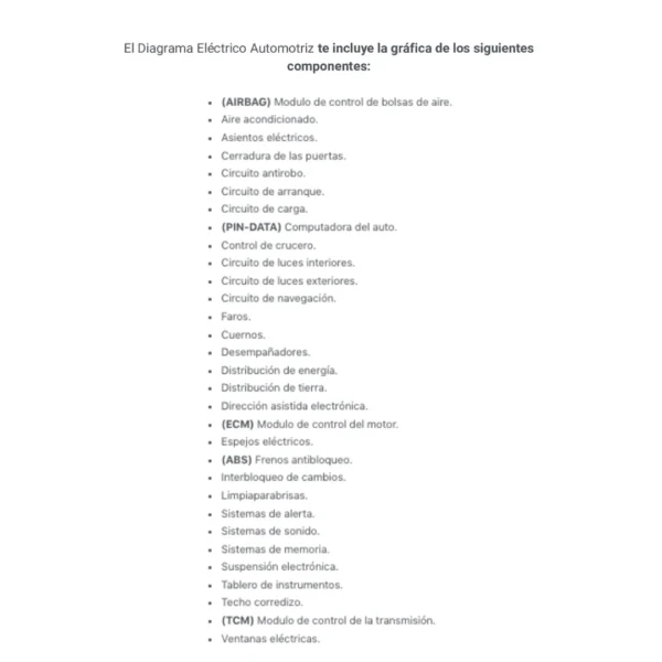 El Diagrama Eléctrico Automotriz te incluye la gráfica de los siguientes componentes: