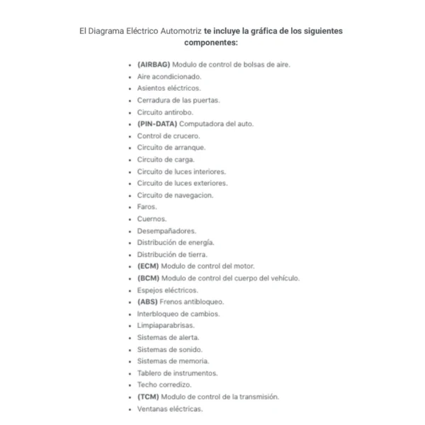 El Diagrama Eléctrico Automotriz te incluye la gráfica de los siguientes componentes: