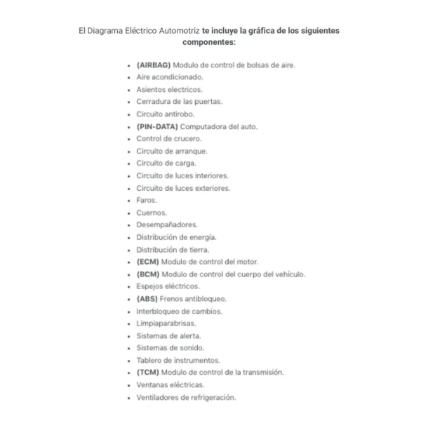 El Diagrama Eléctrico Automotriz te incluye la gráfica de los siguientes componentes: