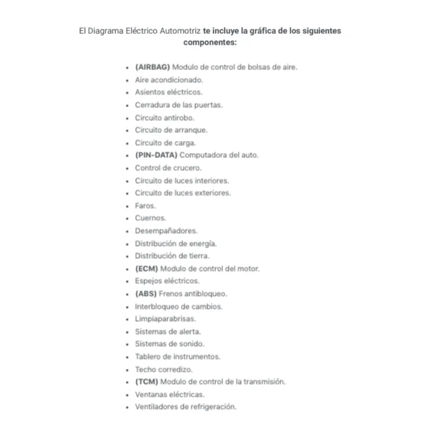 El Diagrama Eléctrico Automotriz te incluye la gráfica de los siguientes componentes: