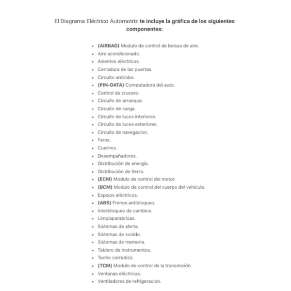 El Diagrama Eléctrico Automotriz te incluye la gráfica de los siguientes componentes: